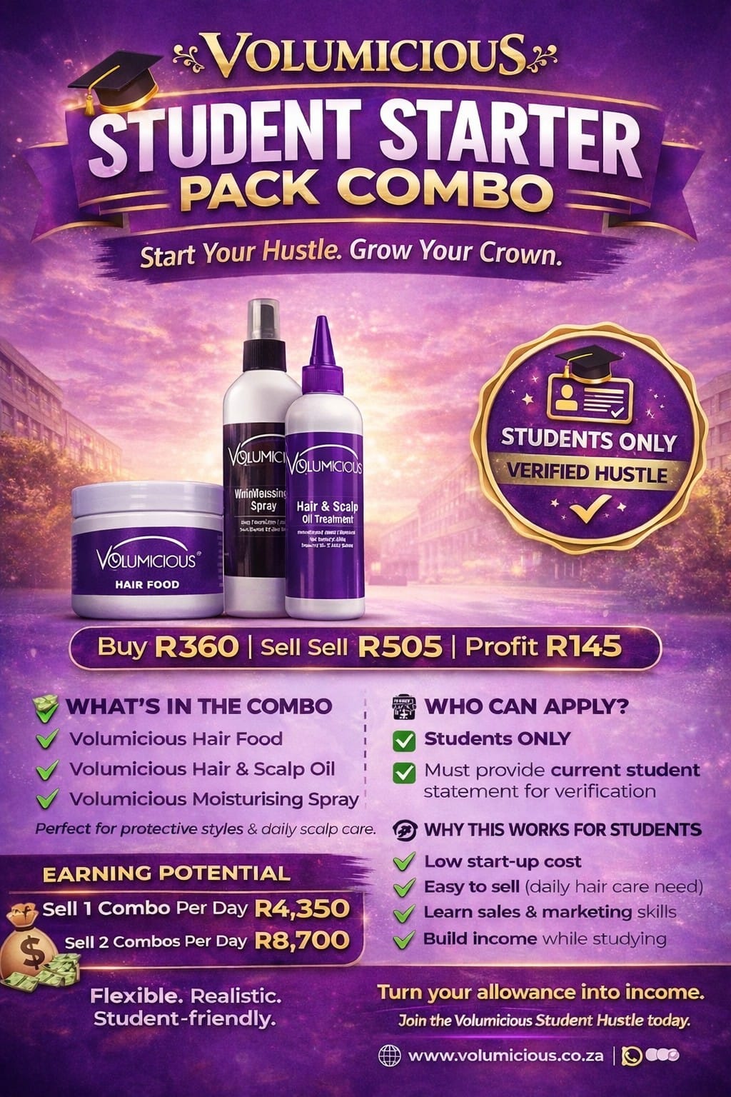 Thank you for the interest of being a Volumicious Distributor. Please fill in the Application Form at the bottom of this page to be considered for the Student Distributor Role. We will confirm the success of your application by confirming that you are indeed a registered student.